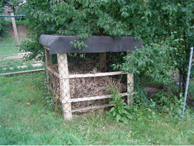 Als Füllung kommt unten eine Lage Stroh, Laub hinein. Darüber Äste und Zweige, die im Garten überall anfallen. Darauf wird ein Dach aus Eternitplatten oder Teerpappe angebracht. Unten können nun Igel einziehen, oben finden Vögel und Insekten einen sicheren Nistplatz. In unseren Quartieren sind die Igel sofort eingezogen. In einigen Fällen haben sogar mindestens zwei Ige lgleichzeitig unter einer Palette überwintert. Das ganze Jahr hindurch freuen sich die Vögel über diesen sicheren und wettergeschützten Unterschlupf.