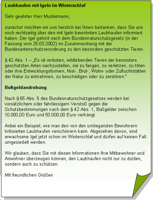 Wir werden immer wieder angerufen und gebeten, schlafende Igel aus einem Laubhaufen umzusiedeln, weil Anwohner Anstoß an dem angeblich störenden Anblick nehmen und den Laubhaufen entfernen wollen. Nachstehend ein Beispiel, wie man darauf reagieren könnte:
