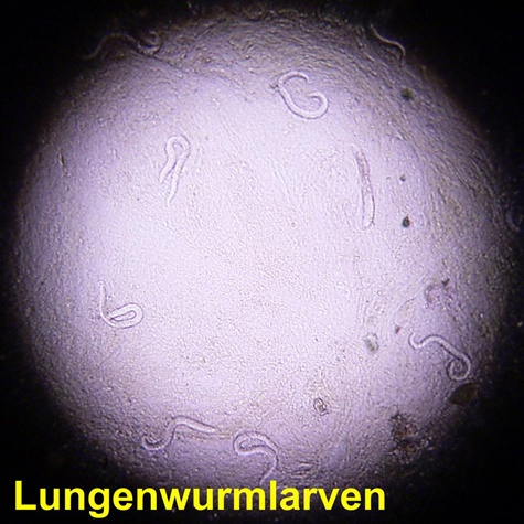 Lungenwurmlarven können im Kot noch von einer feinen Hülle oder frei schwimmend vorhanden sein. Hier sieht es wie ein Stück des Uterus (Unterleib) eines Lungenwurmweibchens mit vollembryonierten Eiern aus.